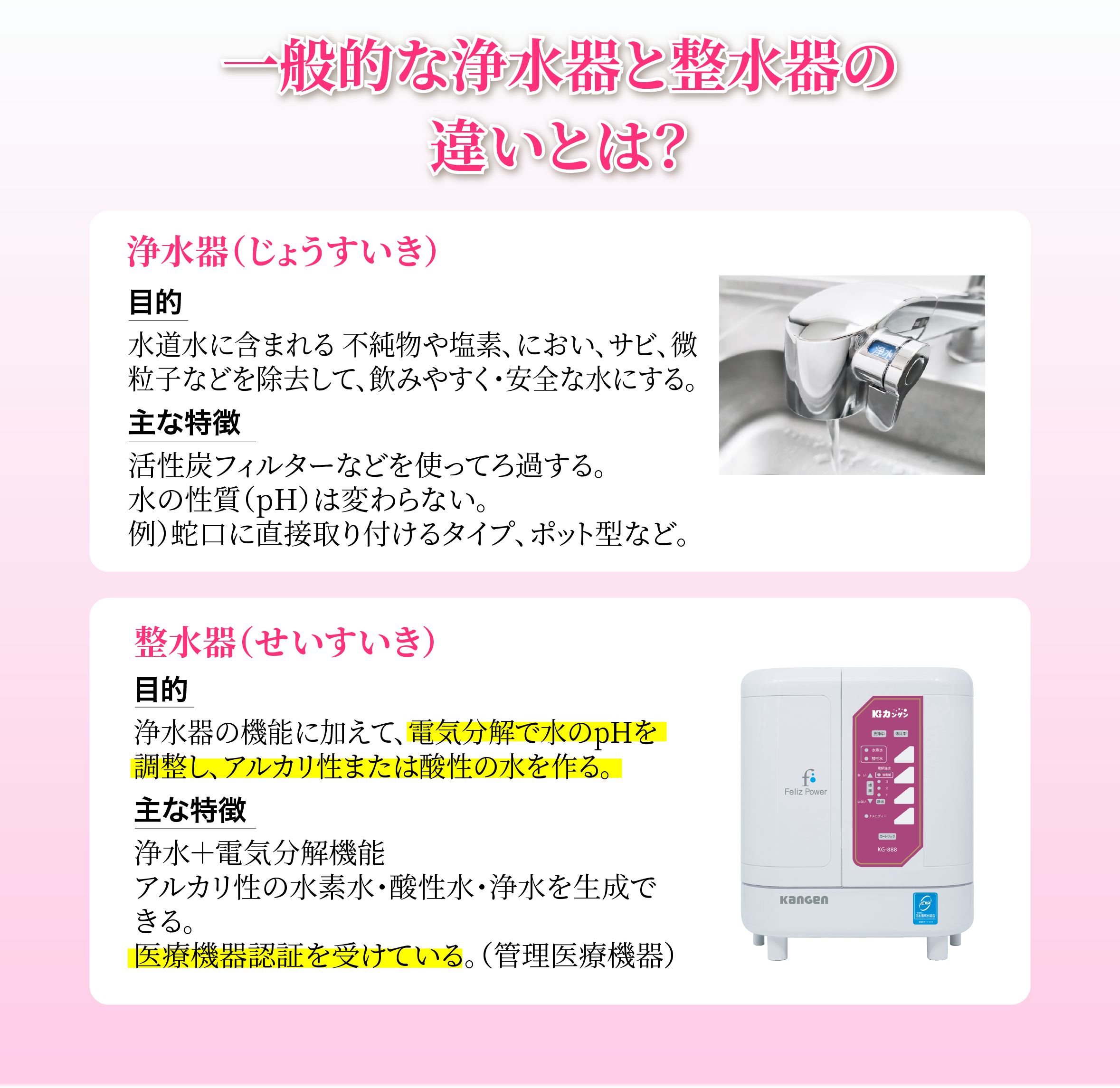 浄水後に電気分解して発生した水素を含んだアルカリ性の飲用可能なお水です。胃腸症状の改善効果が認められている家庭用管理医療機器になります。