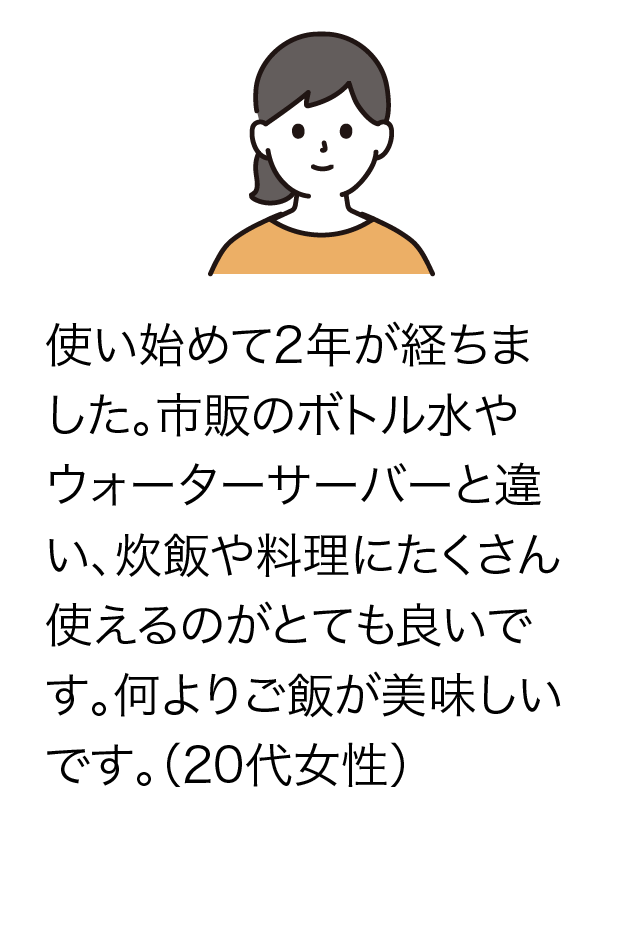 洗顔や入浴などがおすすめです。また、うどんやそうめんの茹で水にすると腰が強く仕上がります。ほかにも切花用の水に使用すると花に良い影響があるといわれております。